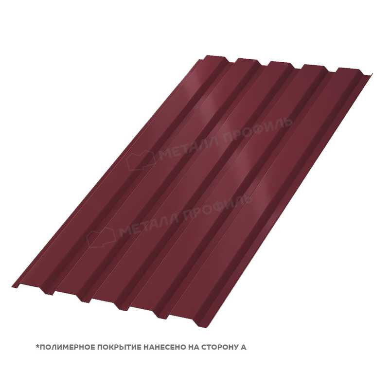 Покрытие этого профилированного листа выполнено на основе полиэстера, что обеспечивает отличную защиту от атмосферных воздействий. Двусторонняя обработка (ПЭ_Д) гарантирует равномерную стойкость к коррозии с обеих сторон материала. Цветовой оттенок соответствует стандарту RAL 3005, который представляет собой насыщенный винно-красный тон, добавляющий элегантности любому объекту. Толщина покрытия оптимальна для баланса между защитой и гибкостью, предотвращая растрескивание при изгибе. Такой слой устойчив к ультрафиолетовому излучению, не выцветает со временем и сохраняет первоначальный вид на протяжении многих лет. Кроме того, полиэстерное покрытие обладает хорошей адгезией к металлической основе, минимизируя риск отслоения даже в экстремальных погодных условиях.